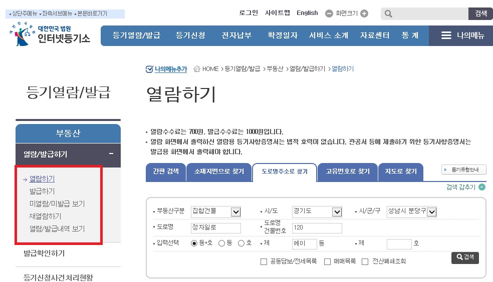 로그인을 하고 등기부등본 열람을 진행 해 볼게요. 여기서, 열람을 해야할지 발급을 해야할지 고민하시는 분들이 있으실텐데요, 그냥 개인적으로 확인만 하고 싶으신 경우에는 열람하기를, 서류로 발급받아 증빙이 필요한 경우에는 발급하기를 진행하시면 돼요. 인쇄의 과정이 있다는 것을 빼고 열람하기와 발급하기 방법은 같습니다. 열람 수수료는 700원, 발급 수수료는 1000원으로 300원의 차이가 있구요.
