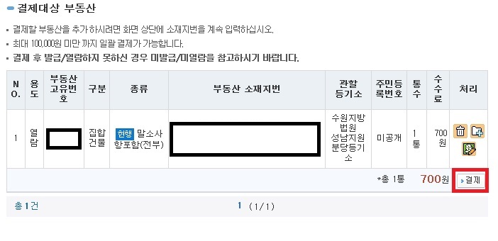 다음으로는 결제를 진행하시면 돼요. 앞서 말씀 드렸듯이 열람은 1통에 700원, 발급은 1,000원 입니다.
