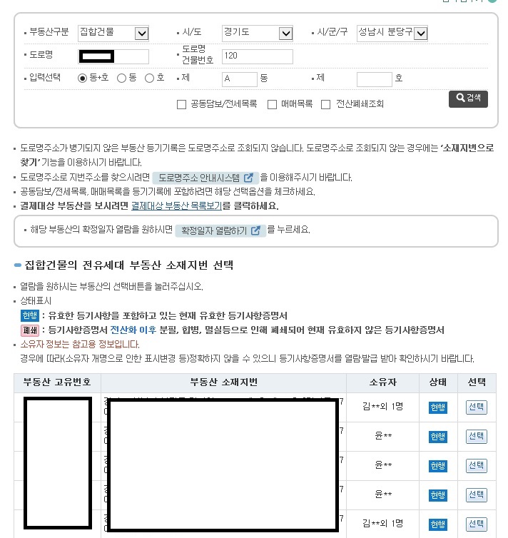 - 동/호수 : 집합건물의 경우 동, 호수까지 입력하게 되어있는데요, 101동이면 '101' 만 입력하시면 되고, A동, B동처럼 알파벳으로 된 경우에는 '에이', '비' 로 한글로 입력하라고 되어있는데 그냥 알파벳으로 A, B로 입력해도 잘 나오더라구요. 호수의 경우에는 이상하게 기입했을 때 조회가 잘 안되는 경우도 있더라구요. 그런 경우에는 동까지만 검색하시고 리스트에서 해당 호수를 찾으시면 됩니다.