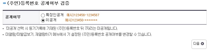 다음으로는 주민등록번호의 공개 여부를 선택하게 되어있는데요, 만약 등기에 나와있는 인물의 주민등록번호가 등기에 표시되게 열람, 혹은 발급을 원하시는 경우에는 특정인공개를 선택 해 주시고, 필요 없으신 경우에는 미공개를 선택 해 주세요.