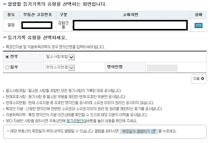 다음으로는 등기에 모든 내용을 표시할 지, 등기 내용 중 일부만 표시할지 선택을 해야해요. 전부, 말소사항포함 으로 진행하시면 해당 등기에 과거 이력들까지도 모두 확인하실 수 있어요. 만약 이미 말소되어서 효력이 없는 내용들까지는 굳이 확인하고 싶지 않으시면 '현재유효사항'을 선택하셔서 진행하시면 됩니다.