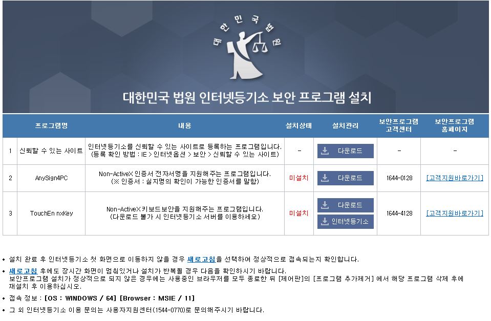 인터넷등기소 홈페이지에 처음으로 접속하시는 것이라면 보안프로그램을 설치하도록 창이 뜰거에요. 사이트 이용을 위해서는 꼭 설치가 필요한 내용들이니 다운로드 버튼을 누르시고 3가지 항목에 대해 다운로드를 진행 해 주세요.