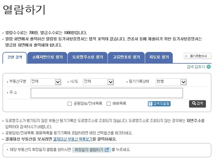 이 글에서는 열람하기를 진행하는 모습을 보여드릴게요. 검색 및 결제까지의 진행과정은 똑같으니 발급을 원하시는 분들도 참고하시면 될 것 같아요.