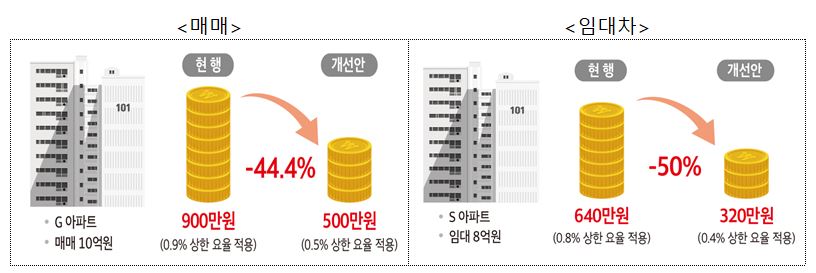 매매의 경우 6억까지는 상한 요율이 기존과 동일합니다. 6억~9억 구간에서 기존 0.5%에서 0.4%로 낮아졌고, 9억 이상은 일률적으로 0.9% 상한 이었던 것을 세 구간으로 나누어 9~12억 구간은 0.5%, 12~15억 구간은 0.6%, 15억 이상은 0.7%로 요율이 낮아졌습니다.