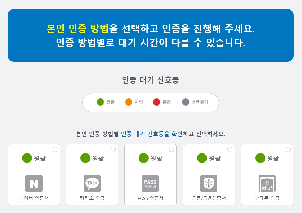 그러면 본인인증 과정을 진행하게 됩니다. 본인인증 방법은 총 5가지에요. 요즘은 백신 접종 예약이 분산되다보니 어떤 방법을 써서 인증을 진행하더라도 원활하게 잘 되는 편입니다. 편하신 방법으로 본인 인증을 진행 해 주세요.