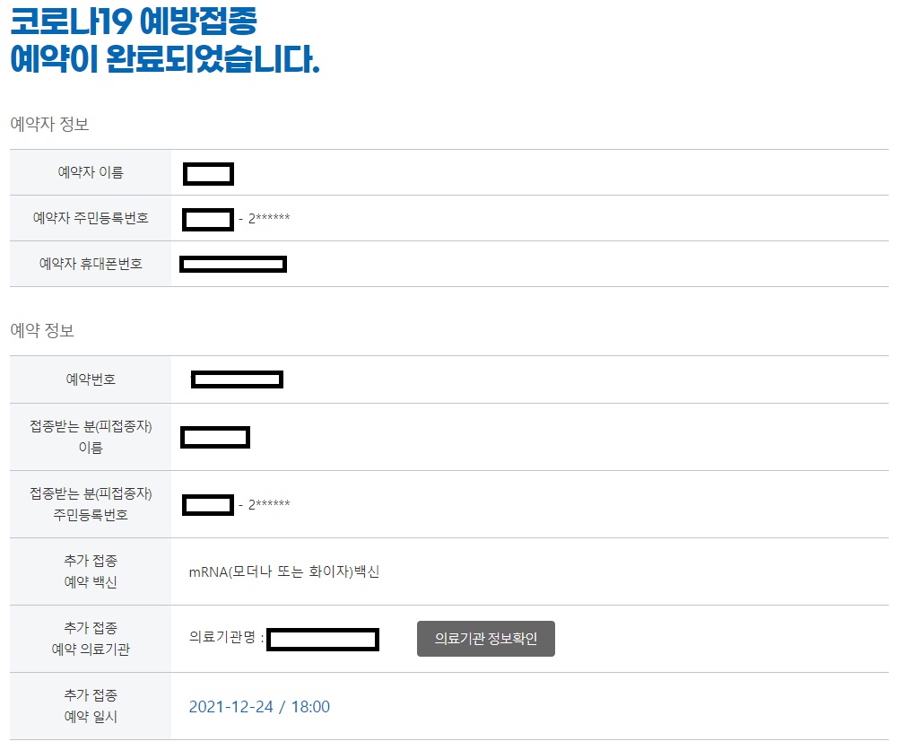 예약버튼까지 누르고 나면 이렇게 백신 예약이 완료되었다는 내용을 확인하실 수 있을거에요. 예약한 의료기관과 접종일시를 잘 기억해 두신 뒤 해당 날짜 및 시간에 접종기관에 방문하셔서 접종을 진행하시면 됩니다.
