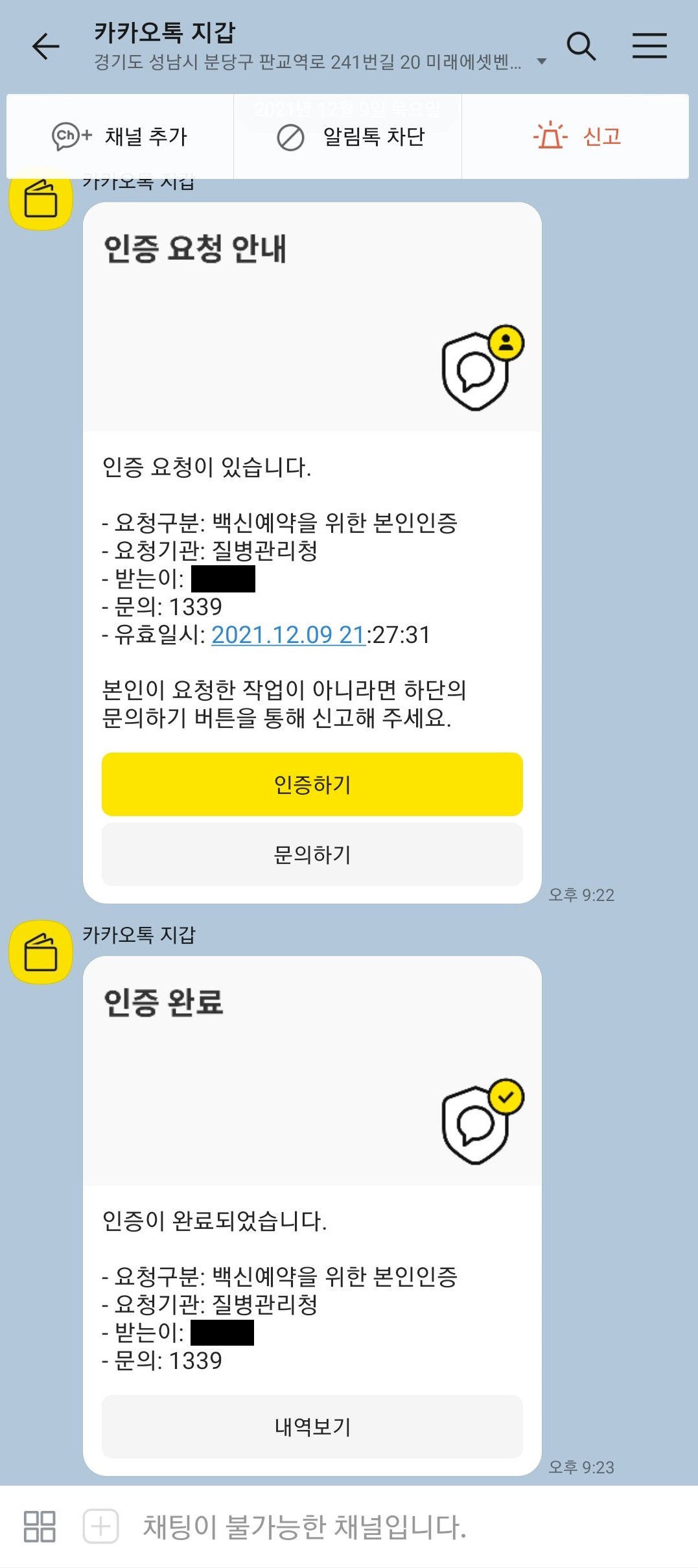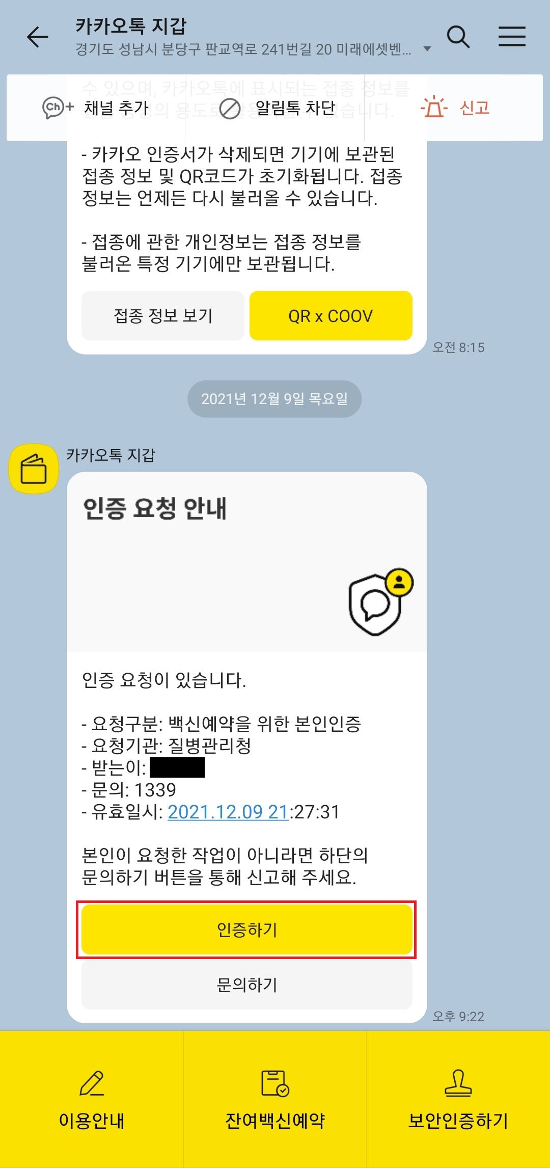 그런 다음 핸드폰 카카오톡을 확인해보시면 카카오톡 지갑으로부터 메시지가 온 것을 확인하실 수 있을거에요. 카카오톡 지갑 메시지에서 인증하기 버튼을 누른 뒤 인증 과정을 마쳐주세요. 그러면 인증이 완료되었다는 메시지를 확인하실 수 있을거에요.