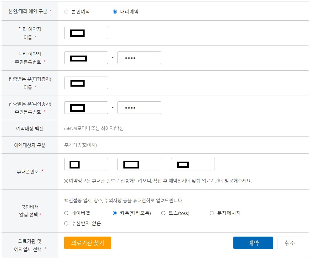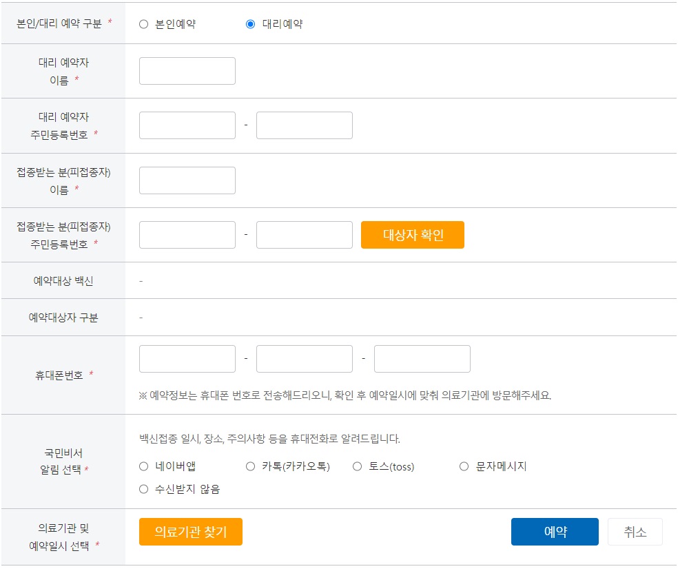 그러면 이렇게 정보를 입력하고 예약을 할 수 있는 화면이 나와요. 이번에는 대리예약을 진행하려 하는 것이니 본인예약과 대리예약 중 대리예약을 선택 해 줍니다.