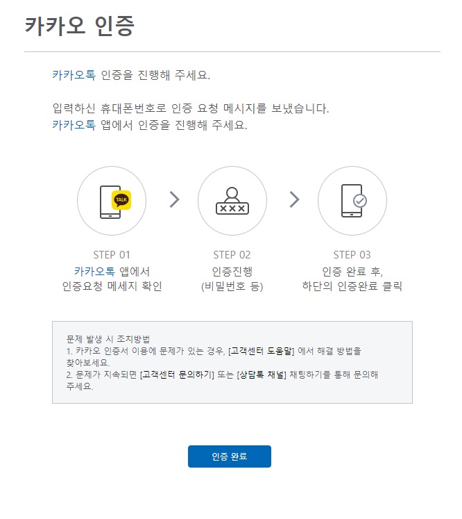 그런 다음 핸드폰 카카오톡을 확인해보시면 카카오톡 지갑으로부터 메시지가 온 것을 확인하실 수 있을거에요. 카카오톡 지갑 메시지에서 인증하기 버튼을 누른 뒤 인증 과정을 마쳐주세요. 그러면 인증이 완료되었다는 메시지를 확인하실 수 있을거에요.