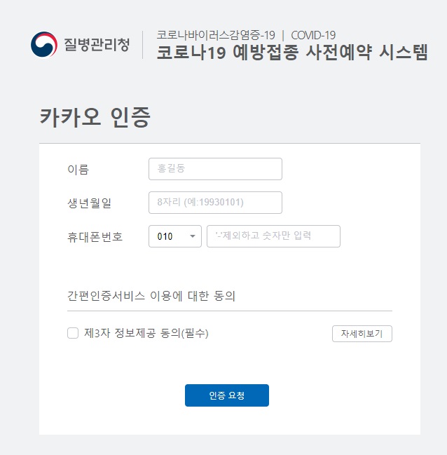 저는 가장 편하게 잘 사용하고 있는 카카오를 통한 인증을 진행 해 보겠습니다. 카카오 인증을 진행하기 위해서는 먼저 이름, 생년월일, 휴대폰번호를 입력한 뒤 제3자 정보제공 동의에 체크표시를 하신 뒤 인증 요청 버튼을 누르시면 됩니다.