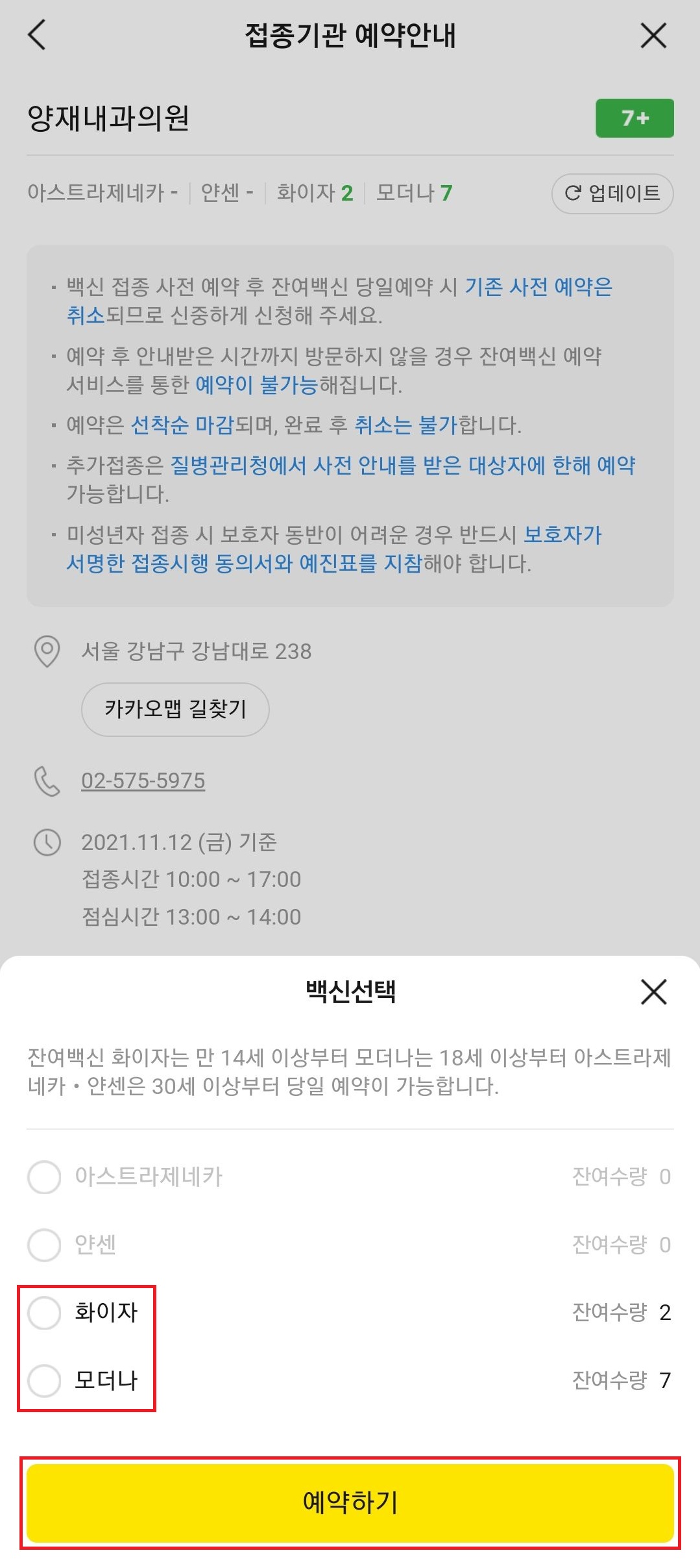 병원을 선택하면 백신 별로 잔여수량이 몇개인지 표시가 되어 있을거에요. 본인이 접종을 하고자 하는 백신의 잔여수량이 1개 이상이라면 당일예약 버튼을 클릭 해 주세요. 그 다음으로 백신을 선택하신 뒤 예약하기 버튼을 클릭하시면 부스터샷 잔여백신 당일예약 완료 입니다.