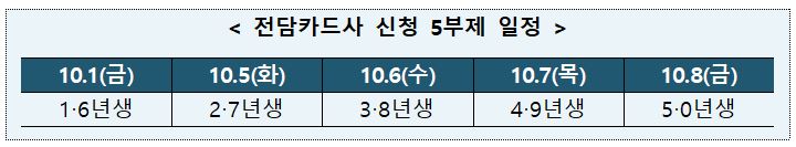 사업이 시행되고 첫 일주일동안은 전담카드사 신청이 5부제로 운영 됩니다. 출생연도 뒷자리에 따라 5부제로 운영되며, 일주일 이후에는 출생연도와 상관 없이 언제든지 신청이 가능 합니다. 전담카드사 신청 5부제 일정은 위의 표를 참고 해 주세요.