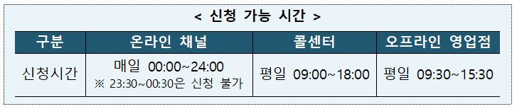 전담 카드사 신청은 온라인을 통해서는 매일 23:30~00:30 1시간동안을 제외하고 23시간동안 가능합니다. 콜센터는 평일 9시부터 6시까지, 오프라인 영업점에서 신청하실 경우에는 평일 9시 30분에서 오후 3시 30분까지 가능하다는 점 참고하셔야 할 것 같습니다.