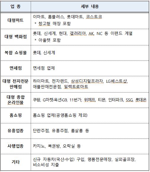 - 대형마트, 백화점, 아울렛, 복합몰, 대형 온라인몰, 명품매장, 신차구입, 유흥업종 등은 제외 됨 (아래 표 참고)