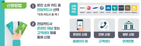전담 카드사 신청은 온라인을 통해서는 매일 23:30~00:30 1시간동안을 제외하고 23시간동안 가능합니다. 콜센터는 평일 9시부터 6시까지, 오프라인 영업점에서 신청하실 경우에는 평일 9시 30분에서 오후 3시 30분까지 가능하다는 점 참고하셔야 할 것 같습니다.