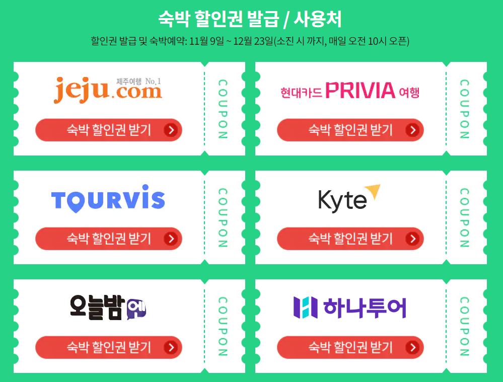 1인당 1회만 할인권 발급이 가능하며, 선착순이기 때문이 서두르셔야 합니다. 투숙 기간은 올해 비성수기의 관광 활성화 목적에 맞게 11월 9일 화요일부터 12월 23일 목요일까지로 한정되어 있다는 점은 참고하셔야 할 것 같습니다.