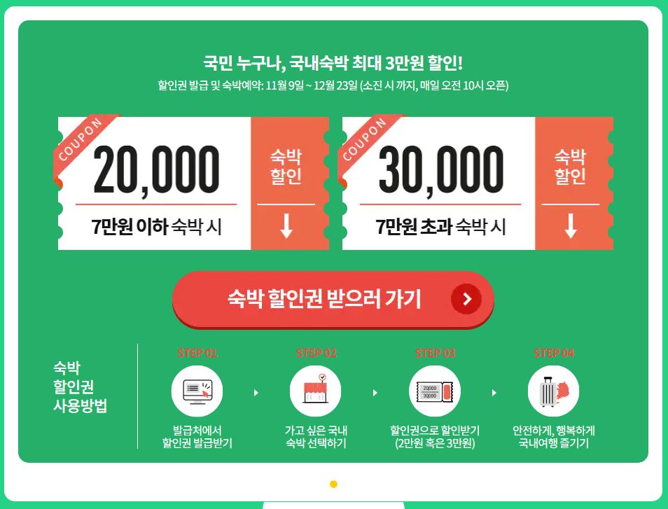 먼저 숙박대전에 대해 소개 해 드릴게요. 숙박대전은 문화체육관광부와 한국관광공사에서 주관하는 행사로 11월 1일부터 시작된 단계적 일상 회복 시행에 발맞추어 진행하게 되었습니다. 11월 9일 화요일 오전 10시부터 전국의 숙박 할인권을 발급해주고 있습니다.