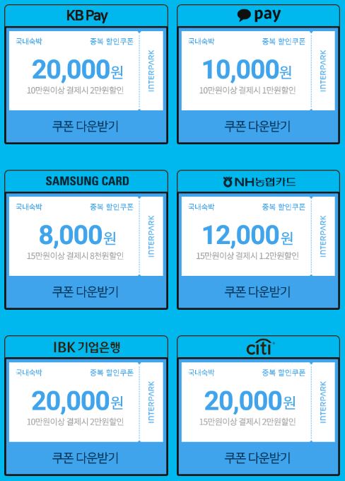 또 사이트별로 추가 혜택도 있으니 사이트별로 둘러보시고 본인에게 가장 많은 혜택을 받을 수 있는 사이트를 이용하시면 좋을 것 같아요. 저는 인터파크 사이트에서 숙박 할인권 다운로드 및 예약하는 모습을 보여드리도록 할게요.