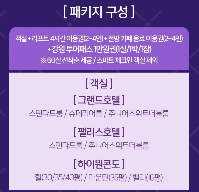 하이원 역시 개장 기념 여러 종류의 할인 이벤트가 진행되고 있어요. 하이원 홈페이지에서 객실과 리프트, 전망카페 등의 패키지를 예약하시면 최대 65%까지 할인된 금액에 예약이 가능합니다. 선착순이니 관심 있으신 분들은 서둘러 하이원 홈페이지 들어가 보시는 것이 좋을 것 같아요.