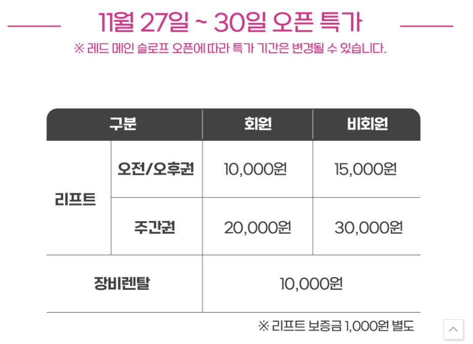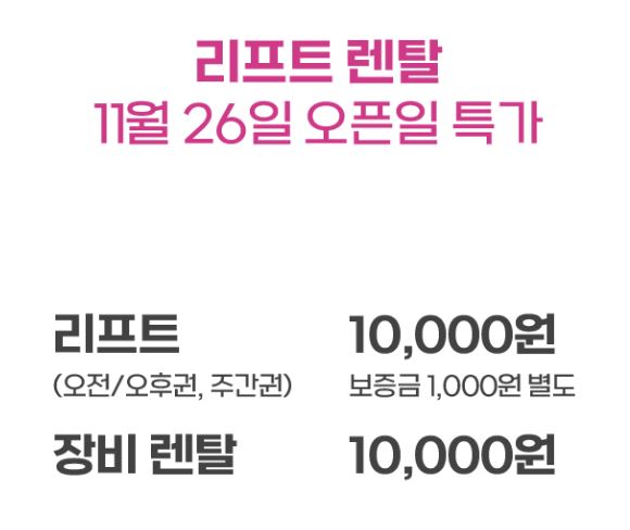 용평 스키장은 개장을 맞아 11월 26일부터 30일까지 오픈 특가 이벤트를 진행합니다. 오픈일에는 리프트권을 10,000원에 판매하며, 11월 27일~30일까지는 회원 오전/오후권 10,000원, 주간권 20,000원, 비회원 오전/오후권 15,000원, 주간권 30,000원에 판매 합니다. 장비렌탈은 해당 기간동안 모두 10,000원에 가능합니다.