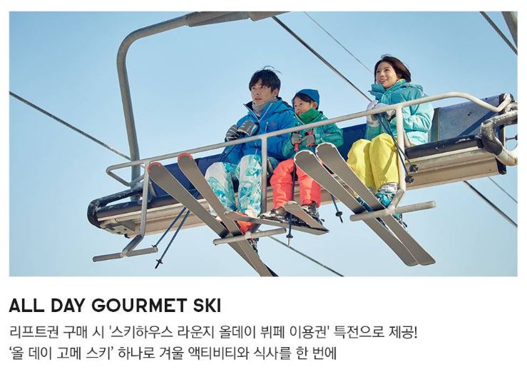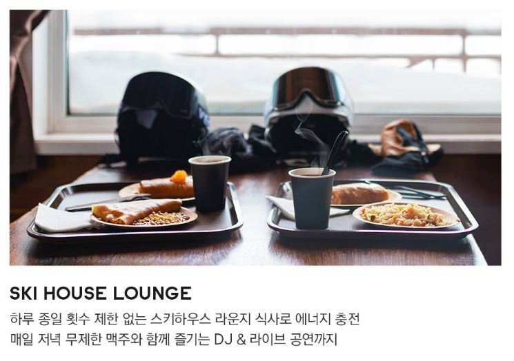 휘닉스파크에서는 리프트권을 구매하면 스키하우스 라운지 올데이 뷔페 이용권을 제공한다든지, 스키하우스 라운지 식사를 무제한으로 이용할 수 있다든지 하는 등의 특전을 제공하고 있습니다. 또 투숙객이라면 누구나 무료 강습 및 장비 대여 서비스도 진행 되는데요, 자세한 사항은 휘닉스파크 홈페이지 참고하시면 될 것 같습니다.