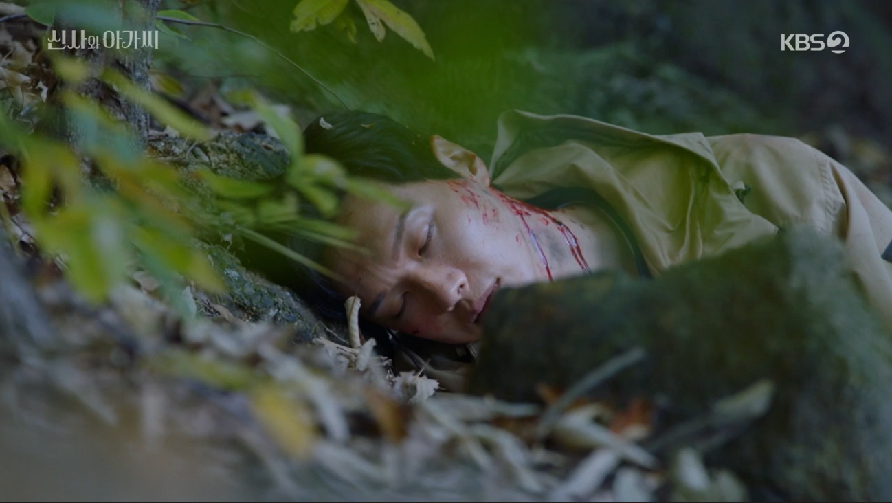이영국은 박단단이 선물한 손수건이 바람에 날아가자 그것을 붙잡으려 했어요. 그러다 산에서 굴러 머리에 피를 흘리고 쓰러지는 모습으로 신사와 아가씨 16회는 끝이 났습니다.