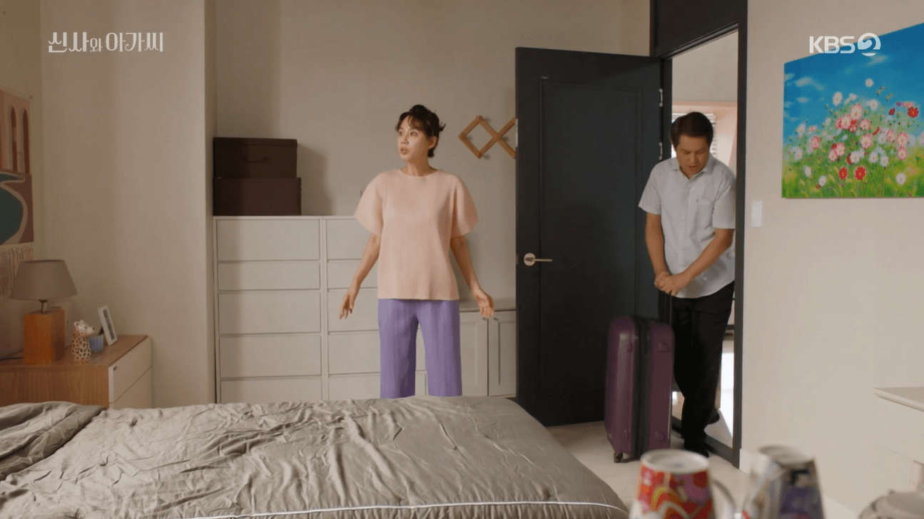 박수철의 짐을 건네주러 온 차연실. 박수철은 차연실을 얼른 보내려고 하지만 차연실은 방을 구경하겠다, 이사하느라 힘들어서 쉬고가야겠다 하며 뭉개죠.