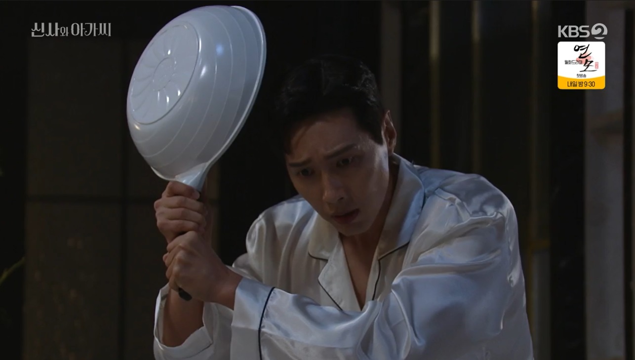 애나킴을 보내고 들어오던 박단단을 도둑으로 오해하고 이영국은 후라이팬으로 잡으려고 했어요. 박단단은 애나킴이 숙소로 간다고 해 배웅하고 온 것이라고 했죠.
