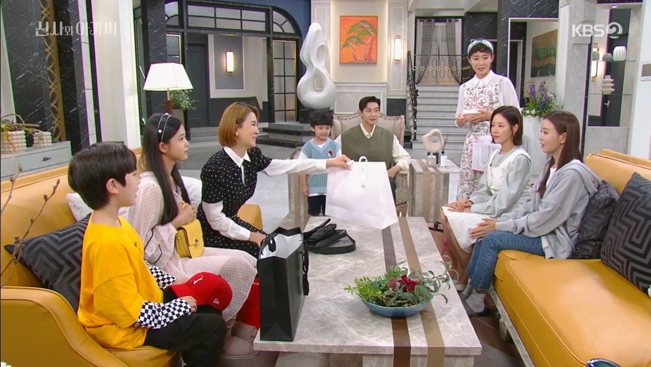 애나킴은 박단단의 옷차림을 보고 옷을 너무나도 사주고 싶었어요. 뭐라고 말하며 줄지 고민하다 모든 집안 사람들에게 선물을 하면서 박단단에게 원피스를 선물하죠.