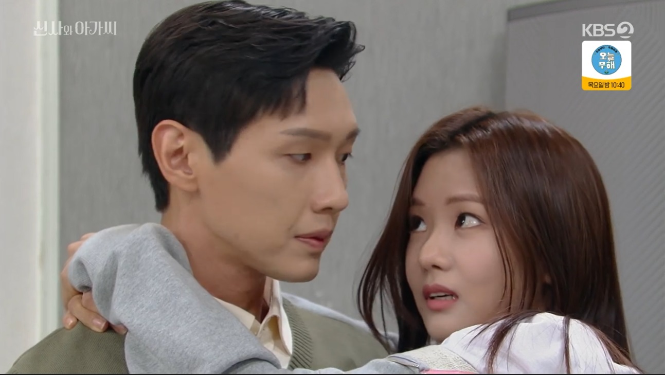 아이들이 시끄러운 소리에 2층에 올라간 박단단과 이영국. 박단단은 장난감 뱀을 밟고 놀라 뛰다 이영국의 품에 안겨버립니다. 두 사람 자꾸 스킨쉽이 잦아지네요.