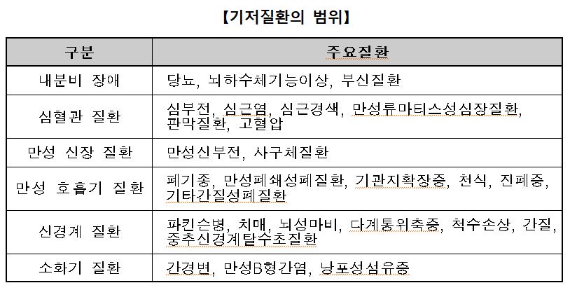 기저질환자의 경우 코로나19에 감염되면 중증으로 발전할 가능성이 높고 사망 위험 또한 높습니다. 따라서 아래 표에 나열되어있는 질환에 해당하는 분이나 의사의 판단 하에 부스터샷 접종이 권고되는 분들의 부스터샷 접종이 시작됩니다.