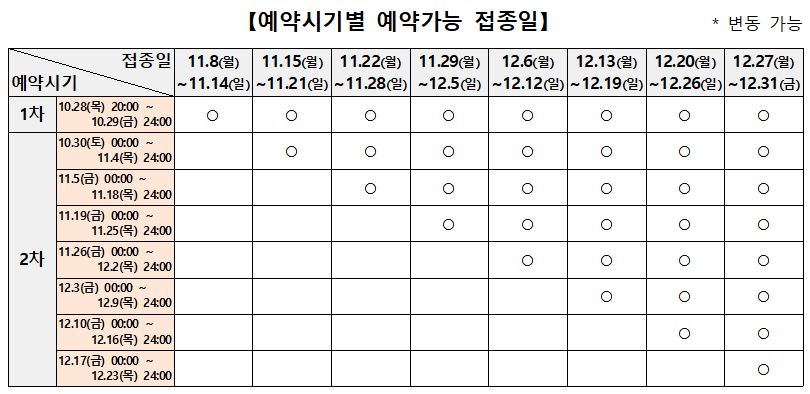예약 날짜별 가능한 접종 날짜는 아래와 같습니다.