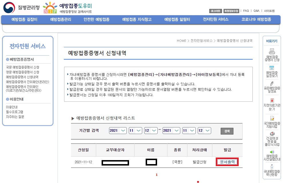 로그인 후에 아까와 동일하게 예방접종증명서 발급 페이지로 들어가서 국문 버튼을 눌러주시면 이와 같이 국문 예방접종증명서를 신청할 수 있는 페이지가 나옵니다. 만약 본인이 아닌 자녀의 예방접종증명서를 신청하시려면 메뉴 중 예방접종관리 → 자녀예방접종관리 → 아이정보등록 에서 자녀를 등록하신 뒤 이용하셔야 합니다.