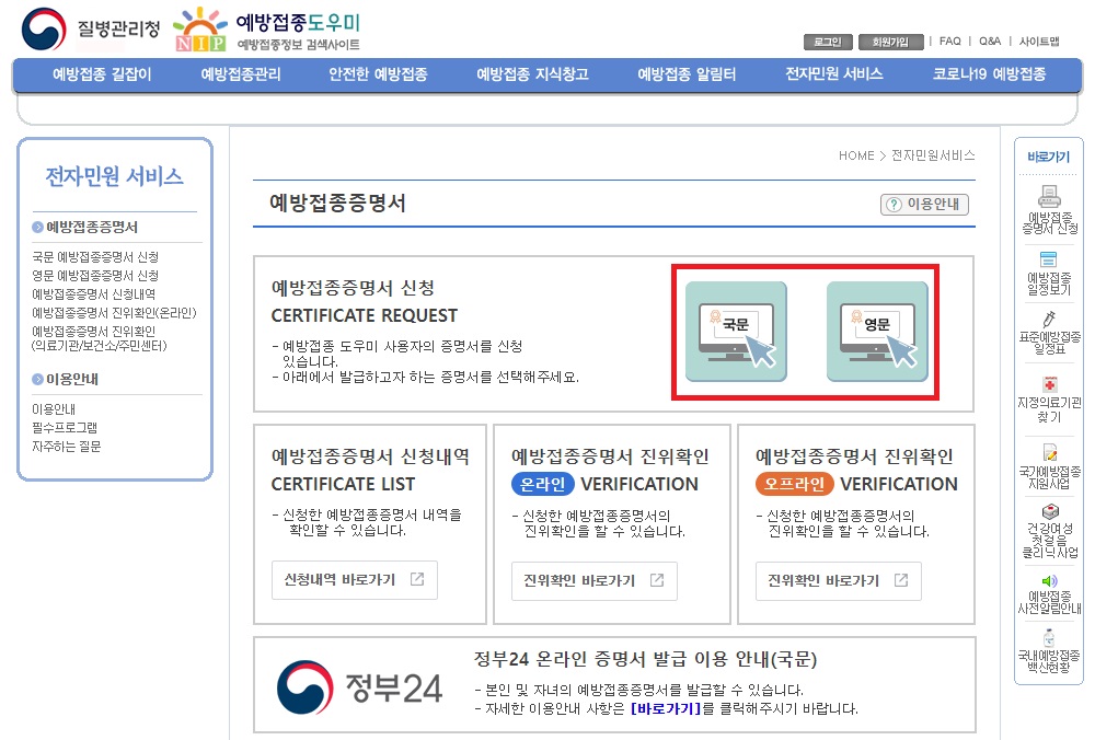 저는 국문 예방접종증명서 발급 과정을 보여드릴게요. 예방접종증명서 신청 부분에서 국문 버튼을 클릭하고 들어가봤습니다.
