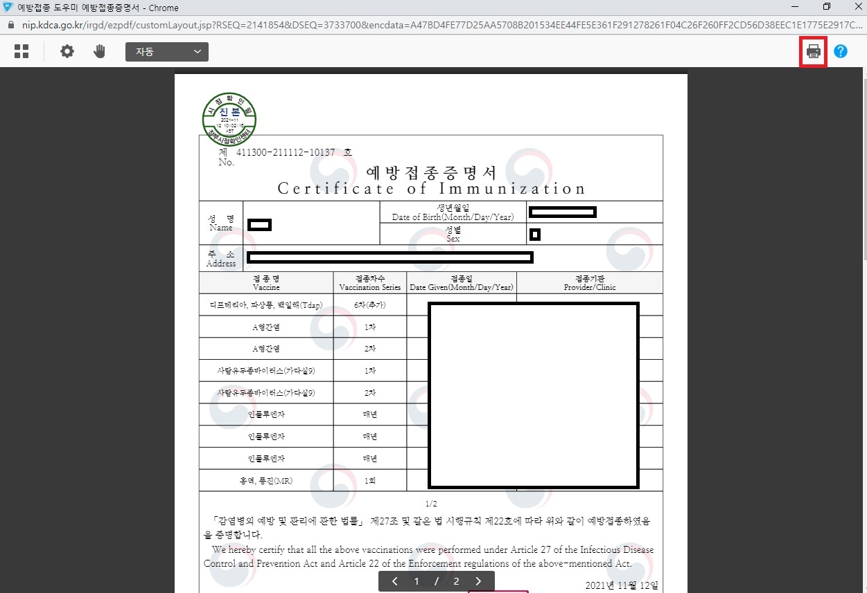 이렇게 예방접종증명서 인터넷발급 완료 입니다.