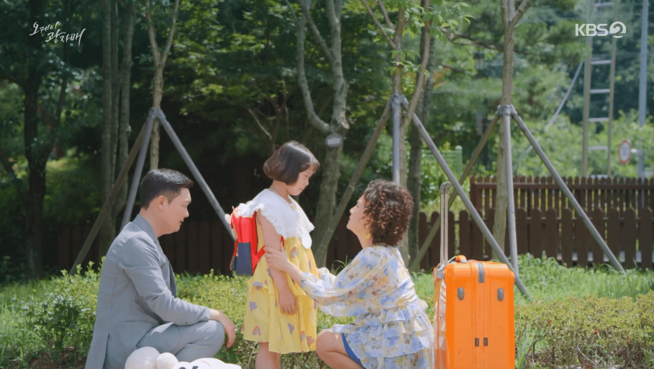 아빠랑 잘 살라며 엄마는 감빵에 잘 다녀오겠다며 뚜기를 변공채에게 보내는 오탱자 였습니다. 너무나 슬퍼하는 오뚜기. 변공채는 떠나는 오탱자를 붙들고는 뚜기랑 같이 셋이 살자고 합니다. 이건 아니라며 그냥 가려는 오탱자에게 변공채는 아줌마가 내 첫사랑이었다고 고백하죠.