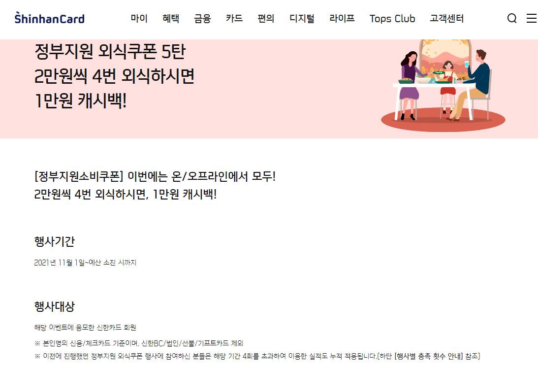 처음 외식쿠폰 신청을 하시는 분은 신청을 원하시는 카드사 홈페이지로 들어가셔서 '정부쿠폰' '외식' 등으로 검색을 하셔서 해당 이벤트를 검색하시면 됩니다. 저는 신한카드를 예를 들어 설명 드려볼게요.