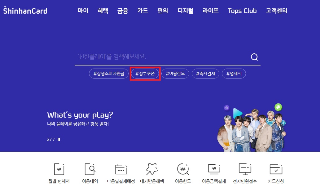 신한카드 홈페이지에 들어가시면 저렇게 검색창 밑에 #정부쿠폰 이라는 것이 보이실텐데요, 클릭을 해 주세요. 만약 보이지 않으신다면 검색창에 직접 정부쿠폰, 외식할인 등으로 검색을 해 보시면 됩니다. 다른 카드사 홈페이지에서도 마찬가지에요.