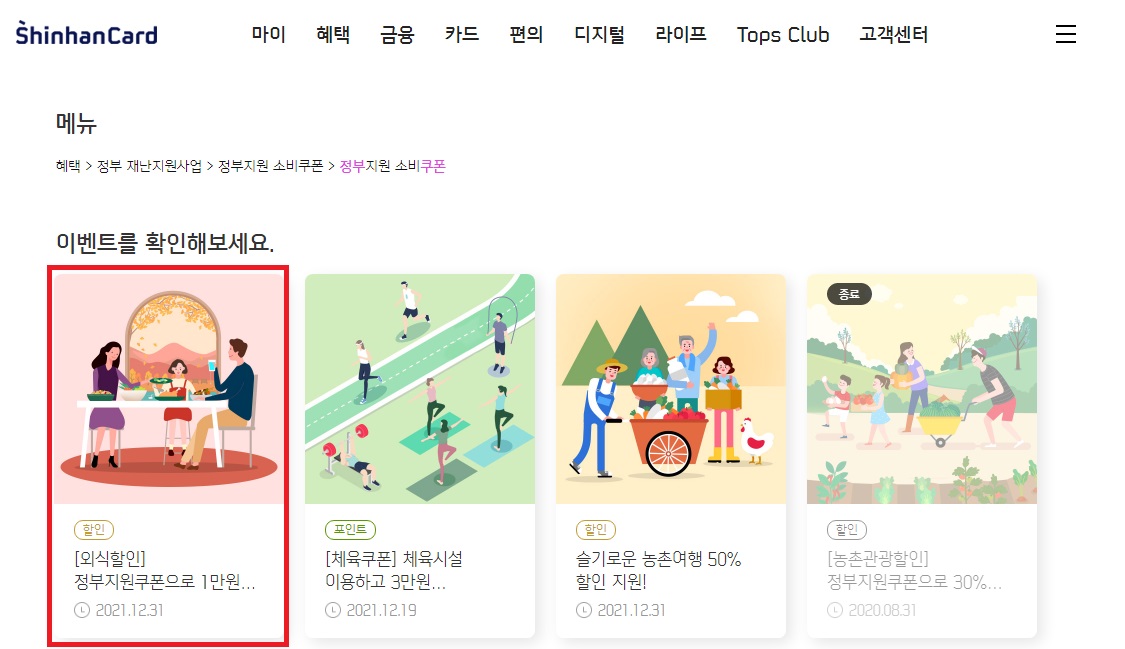 처음 외식쿠폰 신청을 하시는 분은 신청을 원하시는 카드사 홈페이지로 들어가셔서 '정부쿠폰' '외식' 등으로 검색을 하셔서 해당 이벤트를 검색하시면 됩니다. 저는 신한카드를 예를 들어 설명 드려볼게요.