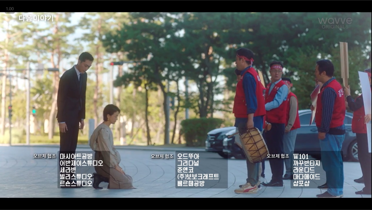 한성혜는 노동자들 앞에 무릎을 꿇는 모습이었어요. 뒤에서는 일이 이렇게까지 된 것은 결국 아버지 때문이라며 아버지를 탓하는 모습이었죠.