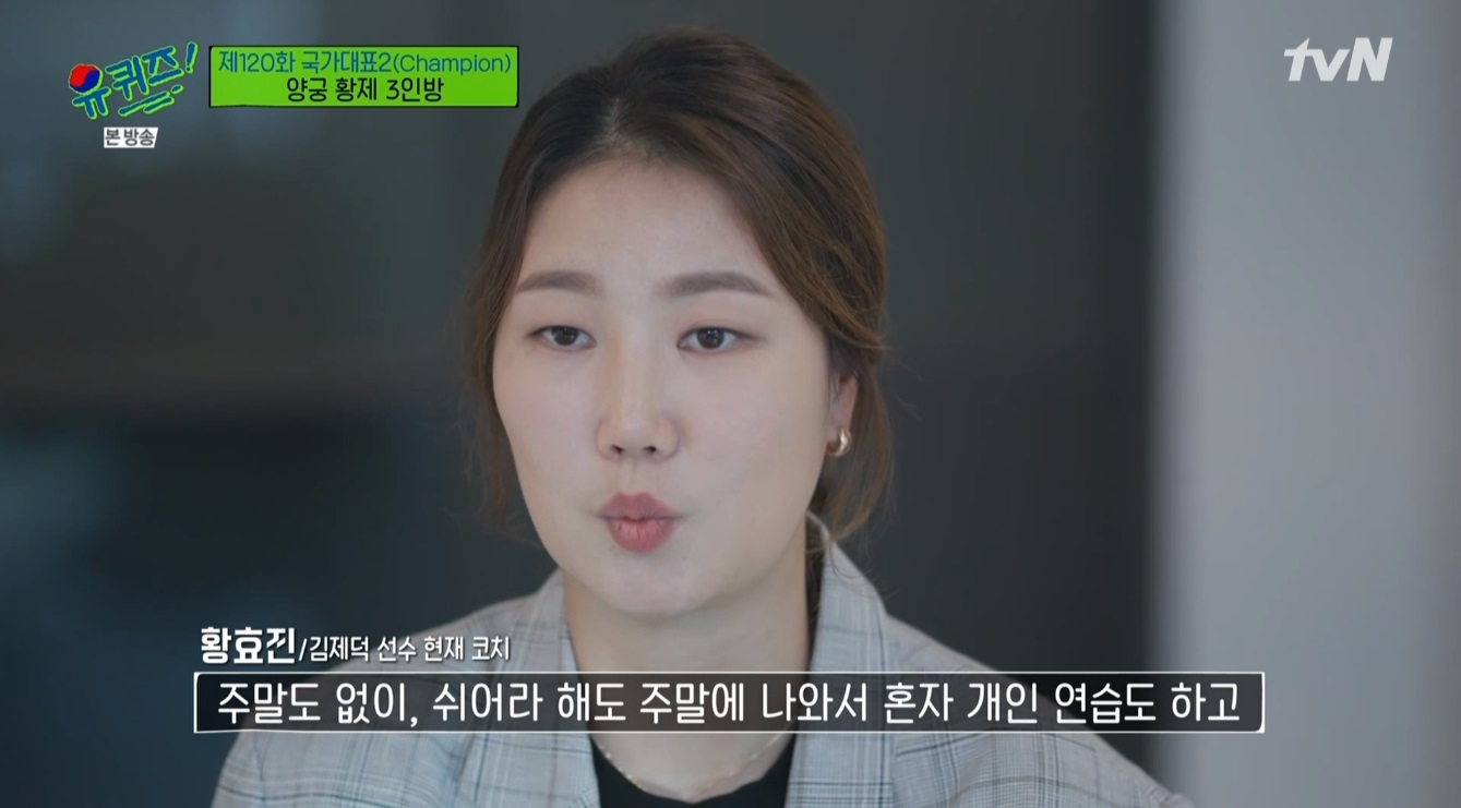 김제덕 선수의 현재 코치인 황효진 코치가 나와서 김제덕 선수에 대한 이야기를 해 주었어요. 정말 누구보다 열심히 연습을 하는 근성 있는 선수라고 했어요.