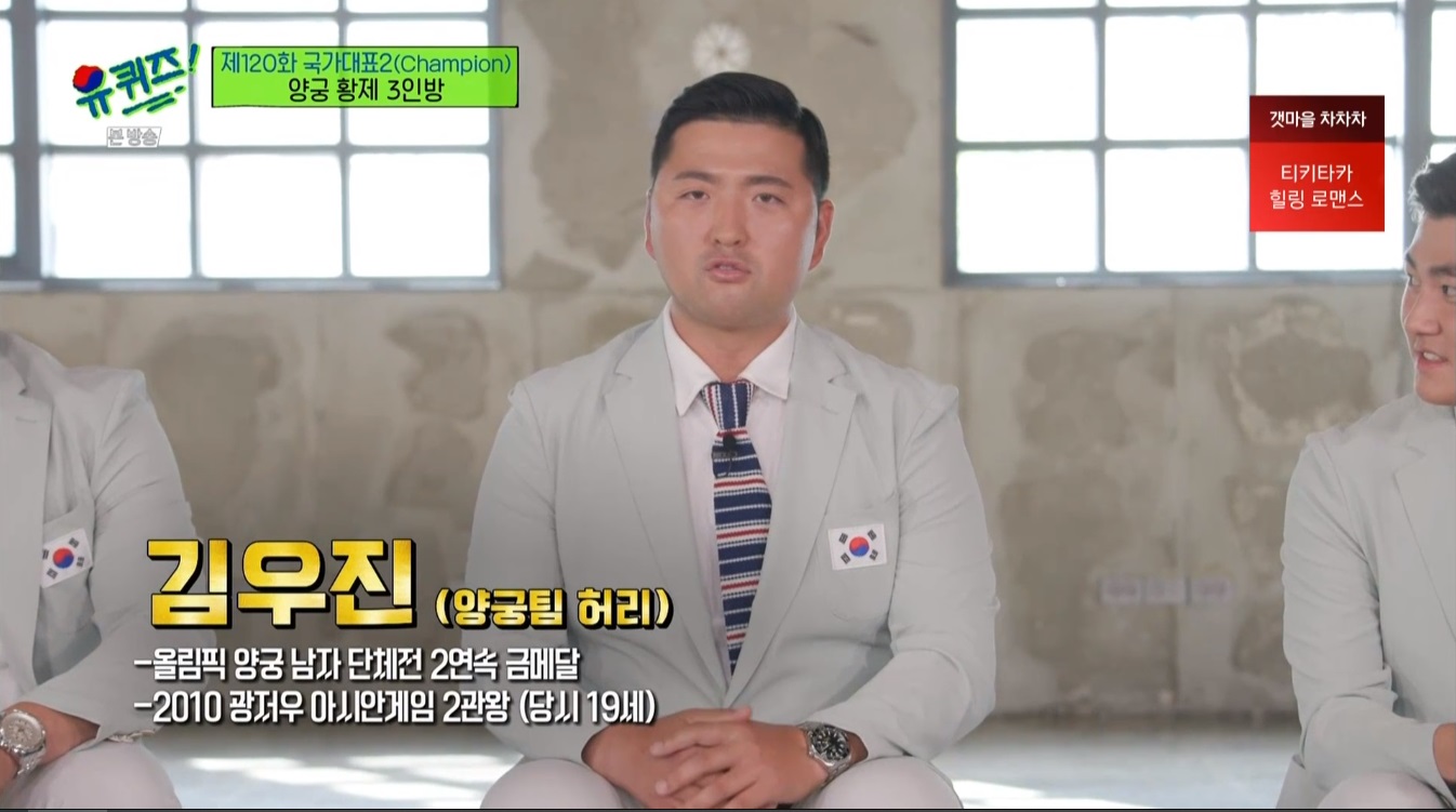 양궁팀의 허리를 맡고 있는 김우진 선수는 올림픽 양궁 남자 단체전에서 2연속으로 금메달을 딴 선수로, 2010 광저우 아시안게임에서 19세의 나이로 2관왕을 했던 선수 입니다.