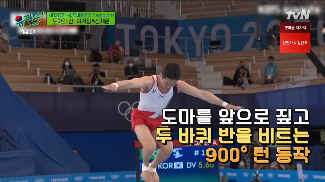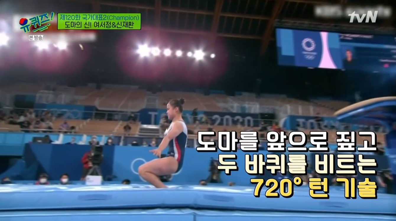 여서정 기술의 시초인 여2 기술은 이번에 도쿄 올림픽에서 신재환 선수가 보여주었는데요, 도마를 앞으로 짚고 두 바퀴 반을 비트는 900도 턴 동작 입니다.