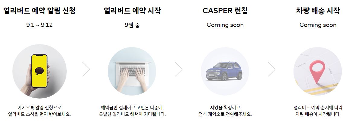 현재 현대자동차 캐스퍼 공식 사이트에서는 얼리버드 예약을 받고 있습니다. 9월 1일부터 12일까지 얼리버드 예약 알림 신청 기간을 통해 예약 알림 신청을 받고, 9월 중 얼리버드 예약이 시작될 예정입니다. 9월 중 얼리버드 예약이 시작되면 예약금을 결제하게 되고, 론칭 시점에 사양을 확정하고 정식 계약으로 전환하게 됩니다. 차량 배송은 얼리버드 예약 순서에 따라 이루어지게 됩니다.