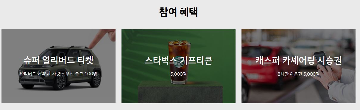 현재 현대자동차 캐스퍼 홈페이지에서는 카카오톡 캐스퍼 얼리버드 예약 알림 신청을 한 사람들을 대상으로 사은품을 제공하고 있습니다. 차량을 최우선으로 출고 받을 수 있는 슈퍼 얼리버드 티켓을 100명에게, 스타벅스 기프티콘을 5,000명에게, 캐스퍼 카셰어링 시승권 5,000명에게 주어질 예정입니다.