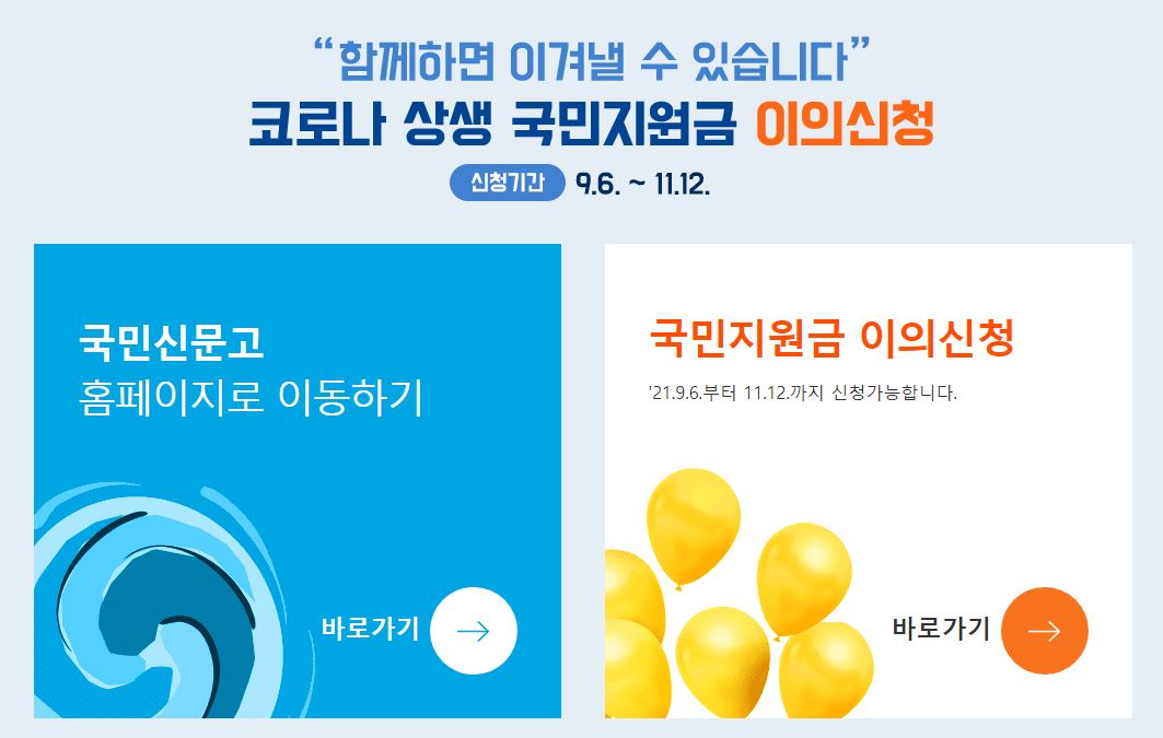 코로나 국민지원금 이의신청 기간 : 2021년 9월 6일(월) ~ 2021년 11월 12일(금)