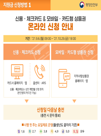 코로나 국민지원금 지급 첫 주인 9월 6일에서 10일까지는 출생 연도 끝자리 기준 요일제로 운영됩니다. 월요일에는 생년월일 끝자리가 1,6인 경우, 화요일은 2,7, 수요일은 3,8, 목요일은 4,9, 금요일은 5,0인 경우 신청하시면 됩니다. 9월 11일 토요일부터는 생년월일에 관계없이 모두가 신청 가능합니다.