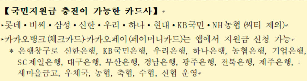 코로나 국민지원금 온라인 신청은 신용카드, 체크카드의 경우 카드사 홈페이지나 앱, 콜센터 등을 통해 신청이 가능합니다. 개인별 신청이 원칙이며 본인 명의의 카드만 가능합니다. 국민지원금 충전이 가능한 카드사는 아래와 같습니다.