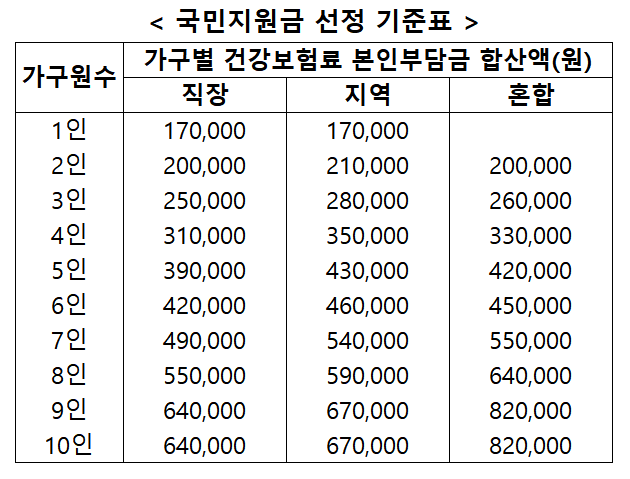 먼저 코로나 국민지원금 지급대상 알려드릴게요. 이번 국민지원금의 경우에는 올해 6월에 냈던 건보료의 가구별 합산 금액이 기준 이하인 경우 지급되는데요, 가구별 지급 기준은 아래와 같습니다.