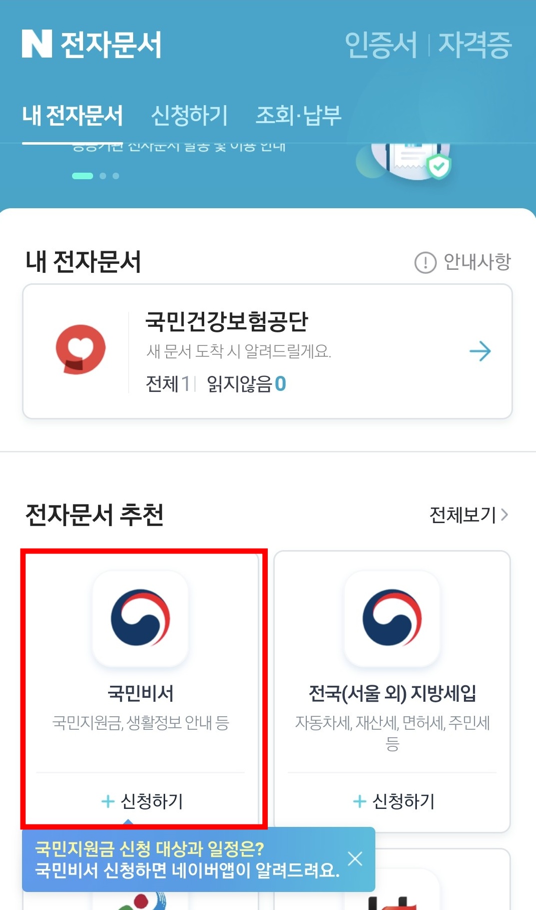 네이버 앱을 처음 실행하시고 오른쪽 상단의 본인 프로필 사진을 클릭하고 들어가신 후, 전자문서 클릭, 조금 아래로 내려보시면 국민비서 신청하기가 나옵니다. 이후에는 앱에 나오는 내용에 따라 동의 확인 등의 절차를 거치면 국민비서 알림 신청이 완료됩니다.